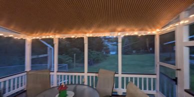 Our screened in porch is accessed through the kitchen. The glass top round table offers outdoor dining for 6 while enjoying the view. A cooling fan or 2 patio heaters allow use even in more extreme weather. A sensor traditional light is available but we find the string lights on a timer offer better ambiance.