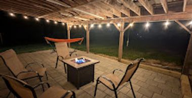 The covered patio behind the garage has a gas firepit table and seating for 8 as well as a hammock.. You may also roll out the grill for use in this area. String lightning again creates a nice ambiance at night. We do offer insect repellent options if needed.